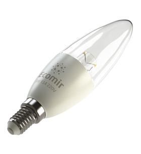 Светодиодная лампа Ecomir E14 3W эквивалентна лампе накаливания мощностью 30 Вт. Колба прозрачная, имеет форму пламени свечи. Потребляемая мощность – 3 Вт, цветовая температура – 3000 К (это желтый свет). Световой поток — 285 лм. Напряжение — 220 В.