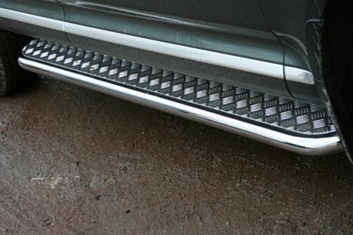 Боковые пороги-подножки сделаны специально для автомобилей Volkswagen Touareg 2006-2009 г.в., поэтому устанавливаются достаточно просто и без повреждений корпуса. Помимо этого, стальные пороги с листом для Фольксваген Туарег смотрятся очень стильно и эффектно. Они добавят вашему авто еще больше солидности и внушительности.