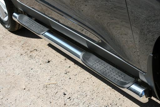 Пороги на Hyundai ix35 – это боковые подножки из нержавеющей стали диаметром 76 мм, которые позволяют более комфортно входить и выходить из салона автомобиля. Подножки Hyundai ix35 очень прочные, надежные и долговечные: они не боятся коррозии, сколов и царапин и выдерживают большие нагрузки.