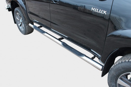 Боковые пороги-подножки сделаны специально для автомобилей Toyota Hilux, поэтому устанавливаются достаточно просто и без повреждений корпуса. Помимо этого, стальные пороги для Тойота Хайлюкс смотрятся очень стильно и эффектно. Они добавят вашему авто еще больше солидности и внушительности.