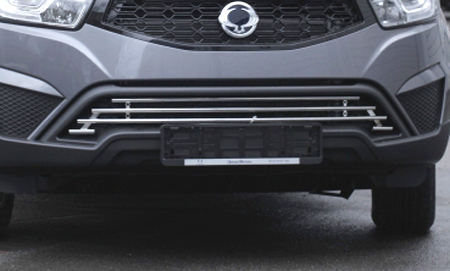 Декоративный элемент воздухозаборника с черными заглушками подходит для автомобилей SsangYong Actyon от 2013 г.в. Изделие изготовлено из нержавеющей стали и представляет собой 1 цельный элемент из трубок диаметром 16 мм.