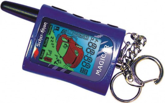 Автосигнализация комплектуется четырехкнопочным брелоком-коммуникатором с большим высокоинформативным ЖК-дисплеем. На экране отображаются данные о состоянии автомобиля: время работы двигателя в автоматическом режиме, температура в салоне, напряжение аккумулятора, состояние батареи брелока (всего один элемент ААА) и множество другой информации, позволяющей держать владельца в курсе всего происходящего с его машиной. Дальность действия двустороннего канала в SCHER-KHAN MAGICAR А составляет 800 метров .