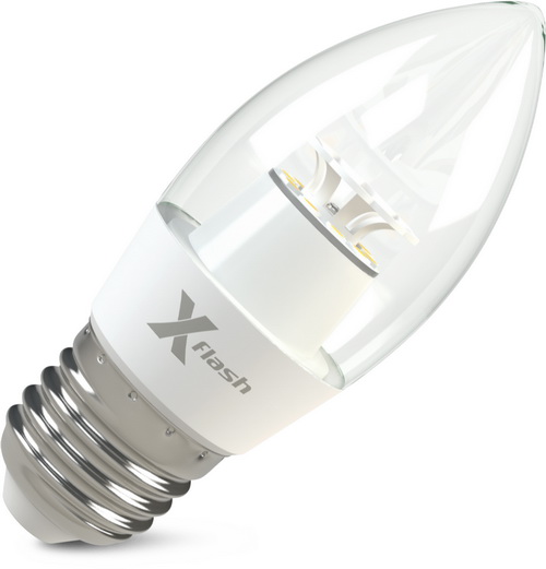 Светодиодная лампа X-Flash CandleE27 используется для общего и декоративного освещения. Колба лампы прозрачная, выполнена в виде пламени свечи. Лампа соответствует по форме, цоколю и размерам аналогичным компактным люминесцентным лампам и лампам накаливания. Может применяться в любых светильниках с цоколем типа «миньон». Данная модель рассчитана на напряжение 220 В. Мощность диодной лампы X-Flash — 6,5 Вт., яркость —500Лм,  угол освещения лампы более 270 градусов, а температура свечения – 3000 K (это желтый свет).