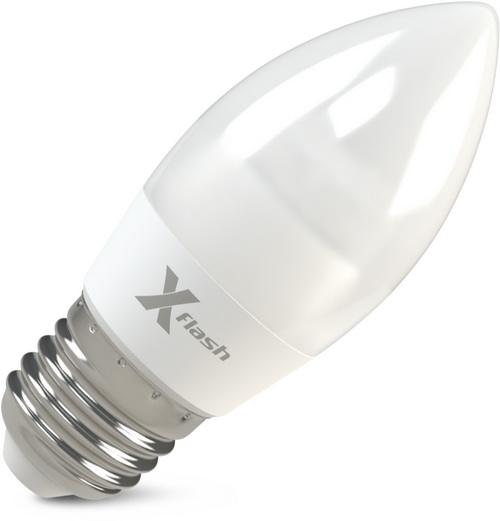 Светодиодная лампа X-Flash Candle E27 предназначается для общего и декоративного освещения. Лампа имеет матовую колбу, выполненную в виде пламени свечи.  Светодиодная лампа соответствует по форме, цоколю и размерам аналогичным компактным люминесцентным лампам и лампам накаливания. Может применяться в любых светильниках с цоколем типа «миньон». Данная модель рассчитана на напряжение 220 В. Мощность диодной лампы X-Flash — 6,5 Вт., яркость —500Лм,  угол освещения лампы более 270 градусов, а температура свечения – 3000 K (это желтый свет).