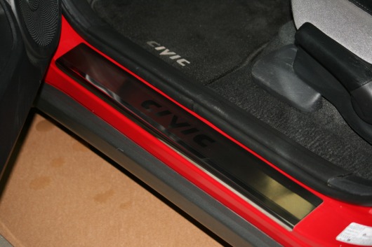 Внутренняя накладка на порог Honda Civic — это аксессуар автомобильного тюнинга, который защищает внутренний порог от механических повреждений при посадке и высадке из машины. Декоративные накладки с рисунком на внутренние пороги предназначены для автомобилей Honda Civic 5D от 2006 г.в.
