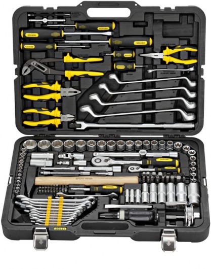 Кроме того, чемодан с инструментом оснащен таким крепежом, благодаря которому все предметы (даже самые мельчайшие – например, биты) остаются на своих местах и при сильной тряске кейса. Но в то же время все инструменты очень легко достаются из пазов. Вам не придется терять время, чтобы достать тот или иной ключ. Просто открыли чемоданчик, нашли необходимый размер гаечного ключа, легко достали и пошли работать. Это очень удобно!