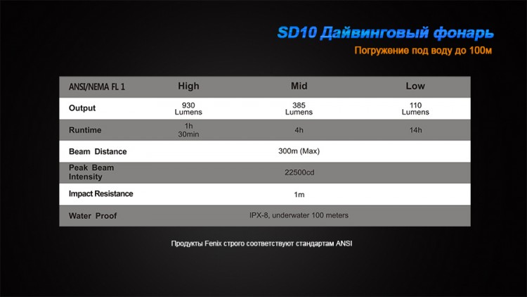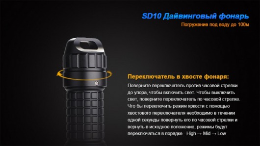 Fenix SD10 Cree XM-L2 (T6) — один из наиболее популярных фонарей для дайвинга. И это не удивительно, ведь с ним можно плавать на глубине до 100 метров. Хорошее освещение обеспечивает мощный и современный светодиод Cree XM-L2. Этот полупроводниковый прибор дает белый свет нейтрального оттенка, который рассчитан на хорошую цветопередачу. Дальность светового луча фонаря составляет 300 метров. В зависимости от условий, его можно включить в 1 из 3 режимов яркости с диапазоном от 110 до 930 люмен.