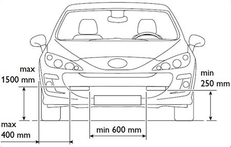 Стандарт установки - R87. Согласно ему LED-элементы должны занимать площадь от 25 до 200 кв.см и излучать свет силой от 400 до 800 кд. Во-вторых, ДХО должны быть установлены не ниже 250 и не выше 1500 мм. Минимальное расстояние между парой огней 600 мм, а от края не дальше 400 мм.