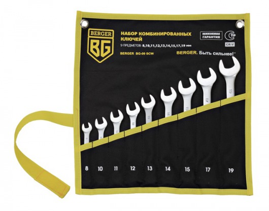 BERGER BG-09SCW — это набор комбинированных гаечных ключей, состоящий из 9 инструментов – от 8 до 19 мм. Комбинированные ключи BERGER BG-09SCW хранятся в удобном чехле, в котором все ключи расположены строго по размеру.