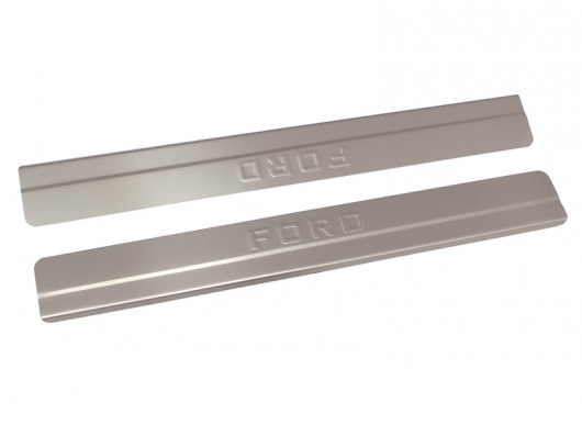 Накладки на металлические пороги дверей Форд Фиеста с логотипом авто не только обеспечивают защиту верхней и боковой поверхности внутреннего порога, но и отлично вписываются в интерьер автомобиля, подчеркивая его стиль и индивидуальность. C монтажом проблем не возникнет: установка накладок на внутренний порог для Ford Fiesta производится на штатные места с помощью скотча 3M.