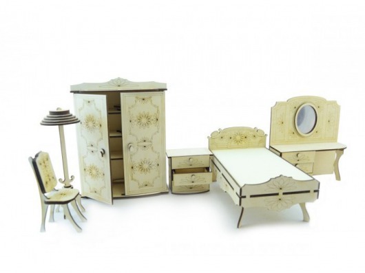 Очаровательная мебель с затейливыми цветочками на гравировке придает уют  кукольному домику.  Также данный набор кукольной спальни можно использовать и отдельно. В любом случае, такая спальня для кукол из дерева – мечта любой девочки!