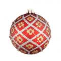 Шар на елку красного цвета с серебряными узорами сделан из стекла. В набор входит 12 елочных шаров, каждый по 8 см в диаметре.